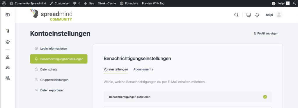 Ansicht: Benachrichtigungseinstellungen im Frontend