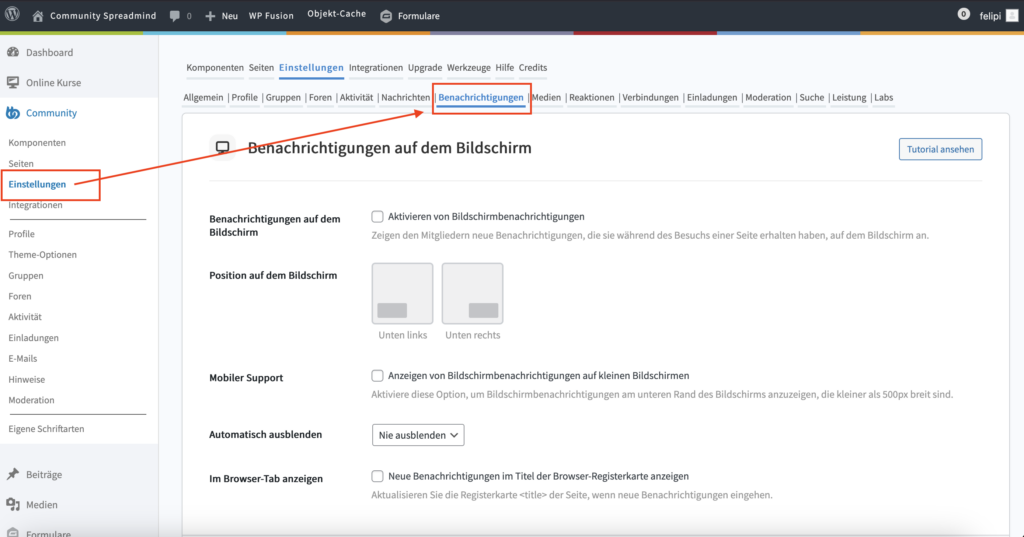 Die Benachrichtigungen können als Administrator einer Spreadmind Plattform für alle User global voreingestellt werden. Über das Backend gelangt man über “Community” > “Einstellungen” > Reiter “Benachrichtigungen” zu den Benachrichtigungseinstellungen.