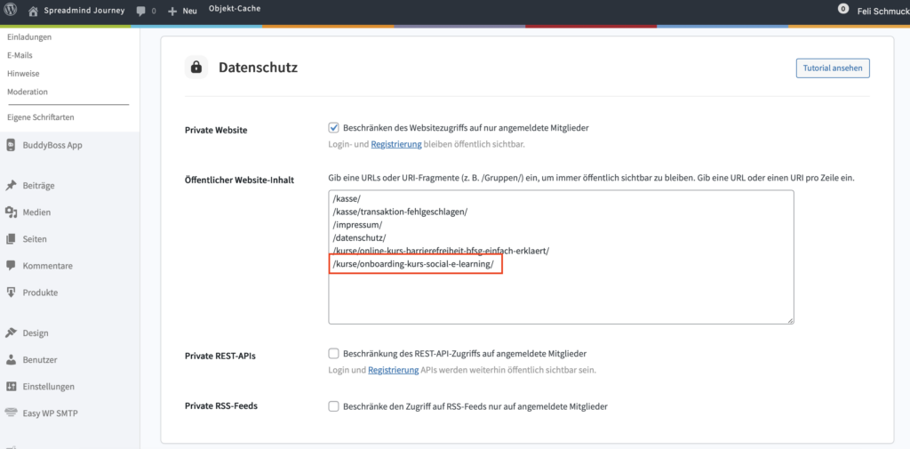 Wenn ihr aber z.B. einen öffentlichen Kurs anbieten wollt, der auch von nicht eingeloggten Interessierten besucht werden soll, dann kannst du den verkürzten Kurslink auf eine Whitelist setzen. Die Whitelist findest du im Backend unter “Community” > “Einstellungen” > Reiter “Allgemein” > Meta-Box “Datenschutz”.