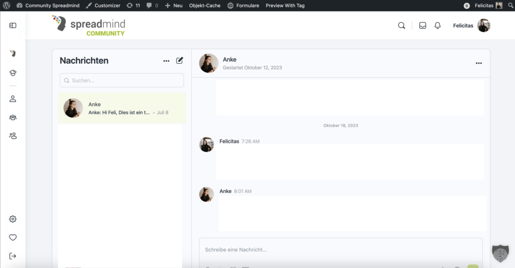 Durch einen Klick auf die Nachricht, gelangt man in den Messenger, in dem sowohl Nachrichten beantwortet, als auch neue Mitglieder kontaktiert werden können.