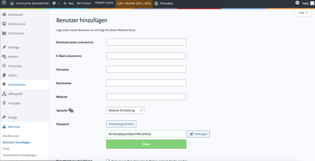 Über die Backend Rubrik “Benutzer” können mithilfe des Buttons “Neu hinzufügen” neue Mitglieder in die Community hinzugefügt werden.