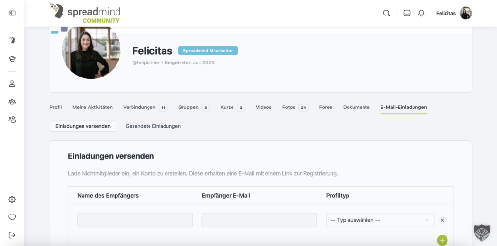 Über das Profil (rechts oben) gelangt der Administrator zum persönlichen Profil. Hier gibt es den Reiter “E-Mail-Einladungen”. Unter Angabe von Name, Empfänger Mailadresse und dem gewünschten Profiltyp, können Mitgliedschaftseinladungen per Mail versendet werden.
