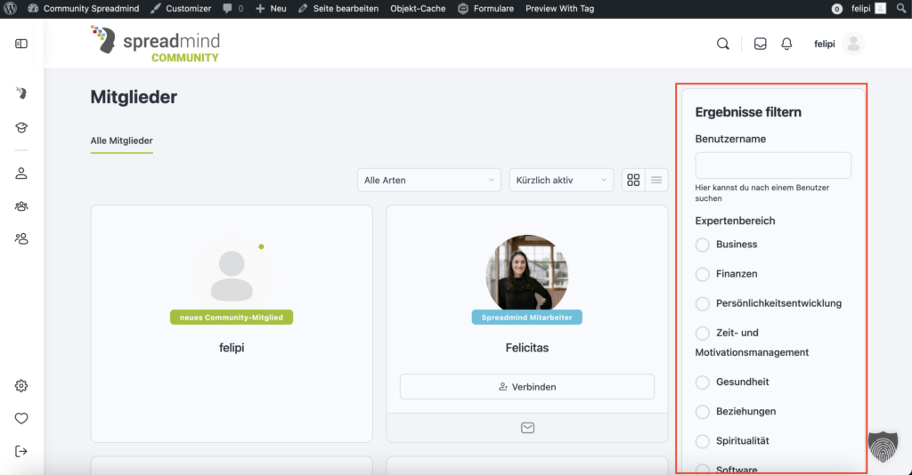 Die Netzwerksuche im Bereich “Mitglieder” hilft dir, genau das zu finden, was du suchst. Das geht dank praktischer Filter und Suchkriterien. Ob nach Namen, Interessen oder Gruppen: Mit wenigen Klicks werden die Ergebnisse gezielt eingegrenzt.