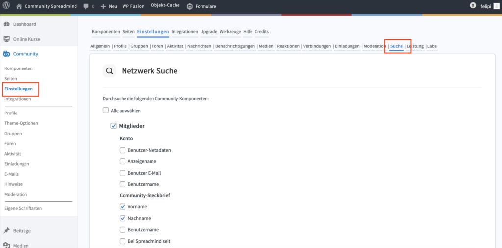 Welche Filteroptionen dort dargestellt werden, muss im Backend unter “Community” > “Einstellungen” > “Suche” festgelegt werden.