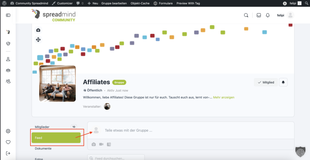 Der Gruppenfeed zeigt nur die Beiträge und Aktivitäten, die innerhalb einer bestimmten Gruppe passieren. Ideal, wenn du den Überblick über Diskussionen, Dateien oder Events in genau dieser Gruppe behalten willst.