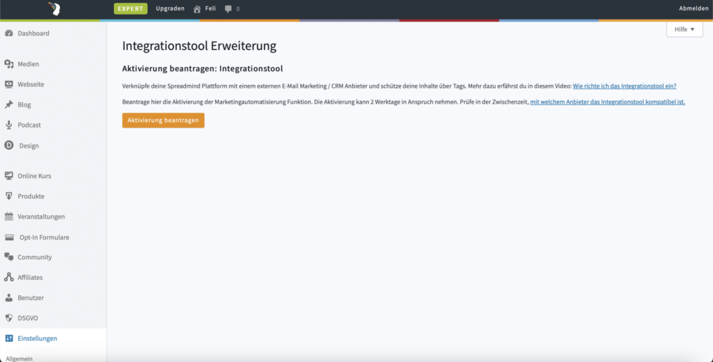 Wenn du bei deiner Plattform einen Mehrwert erkennst und die Grundeinstellungen getätigt hast, kannst du im Backend unter “Einstellungen” > “Integration” den Button “Aktivierung beantragen” klicken und so die Beantragung an den technischen Support weitergeben.